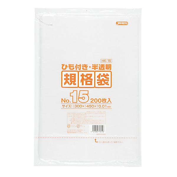 ジャパックス HD規格袋ひも付きタイプ 半透明 No.15 HDPE 厚み0.010mm 200枚入x1冊 HK15