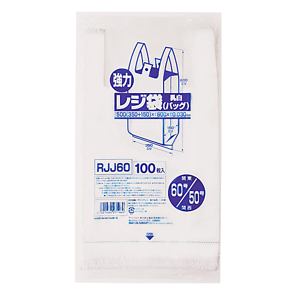 | 製品名 | ジャパックス レジ袋レギュラータイプ 乳白色 関東60号関西50号 【HDPE】 RJJ60 厚み0.030mm 100枚入x1冊 |